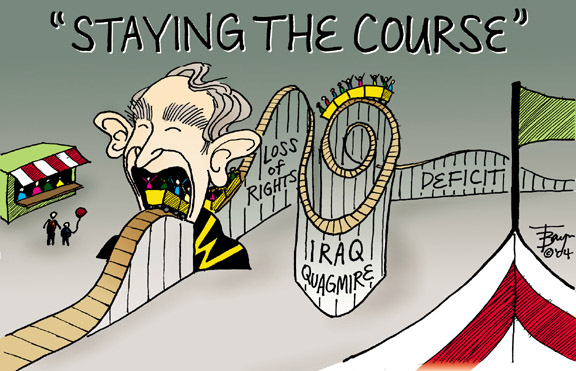 With the election of Barack Obama, I think this roller coaster was shut down - except for the deficit which is currently exploding in size. A footnote: this was the first one of my cartoons published in the Best Editorial Cartoons of the Year series, edited by Charles Brooks; in the 2005 edition, I believe.