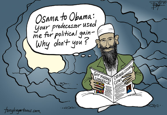 It's funny how Bin Laden surfaces whenever presidents are in political trouble. Not to diminish the fact that the guy is pure evil and we should be vigilant of him and Al Quaida, but let's face it, his very existence helped G.W. politically. My point here is that so far, Obama has been above exploiting widespread fear of Osama, and I hope that continues...